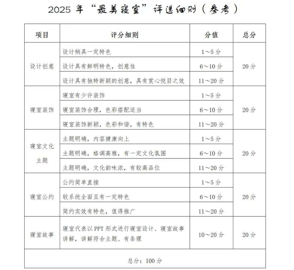期待各寝室亮出整洁空间、独特文化与鲜活故事,以评比为契机共筑舒适小家,让寝室成为青春里的成长坐标!