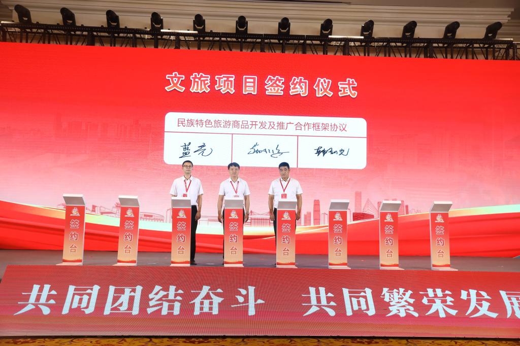 活动以《民族歌舞快闪串烧》开场,在文旅合作签约环节中,beat365在线唯一官网与兰溪市水亭畲族乡、武义县柳城畲族镇签订民族特色旅游商品开发及推广合作框架协议。